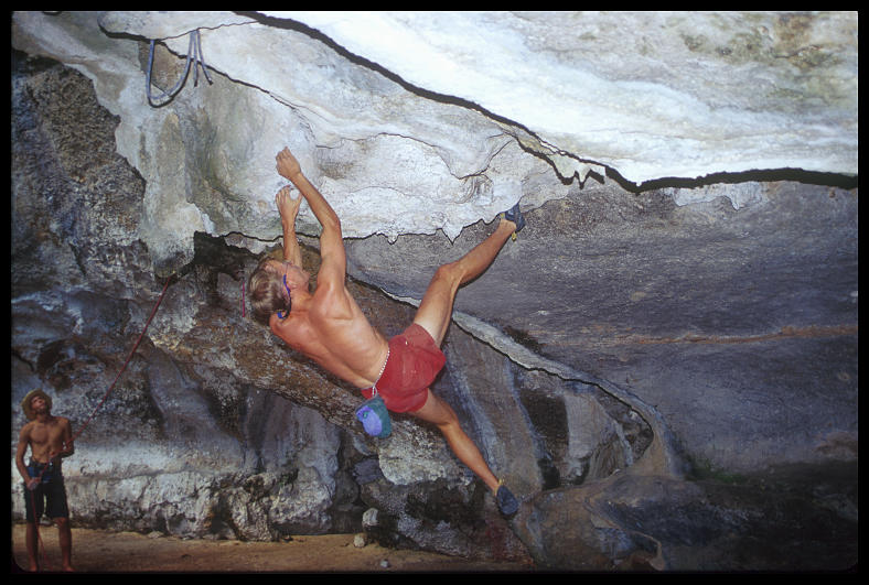 David Benson bouldering "By Way of Deception" (7a) for the camera.