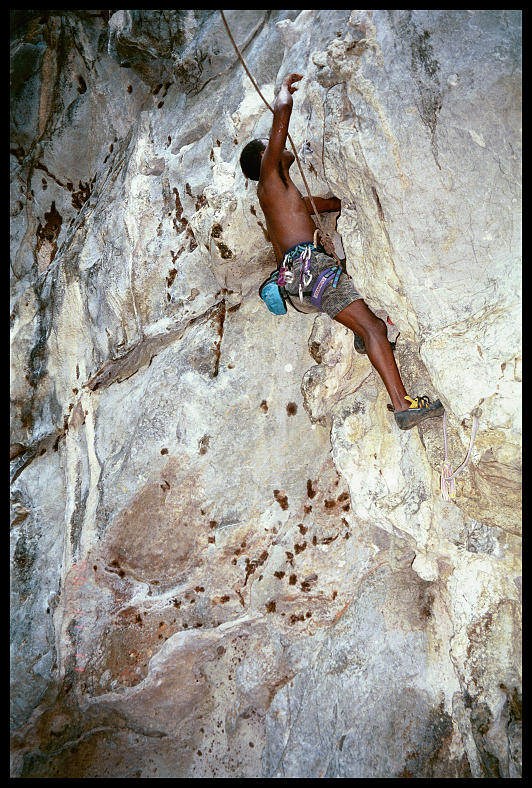 Darryl Jones climbing "Monkey Gone to Heaven" (6b) at Defile Exit