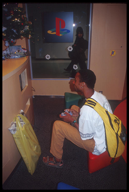 Darryl Jones passing time playing video games at the Tokyo airport