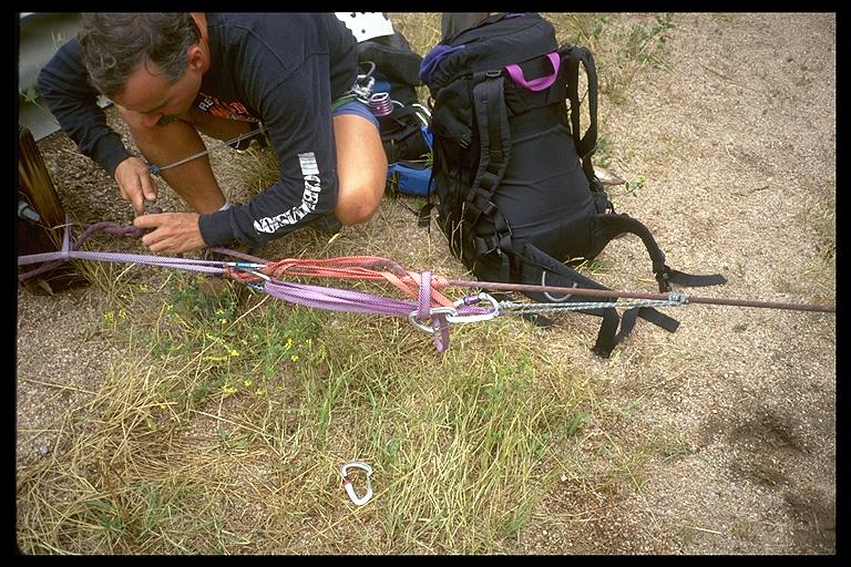 Dennis Maher using a z-pulley to tighten the rope across the river. Boulder Canyon, Colorado