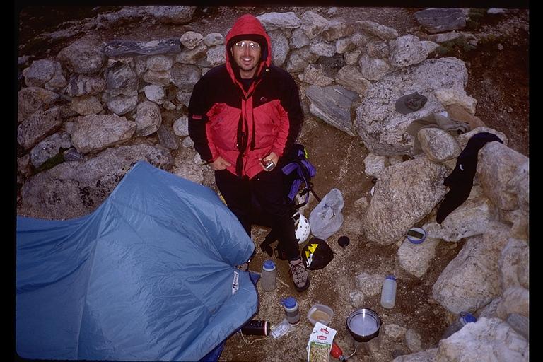 Ian Springsteel infront of our tiny tent at the Lower Saddle, Grand Teton, Wyoming