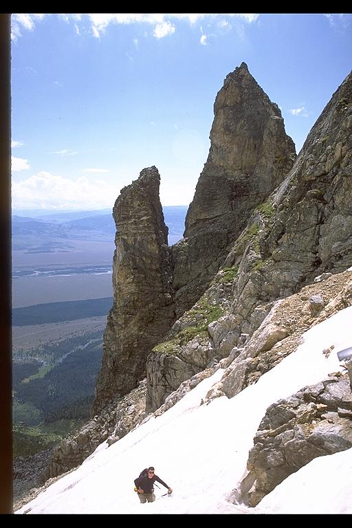 Ian Springsteel hiking past the Idol and the Worshiper on Teewinot, Grant Teton NP, Wyoming